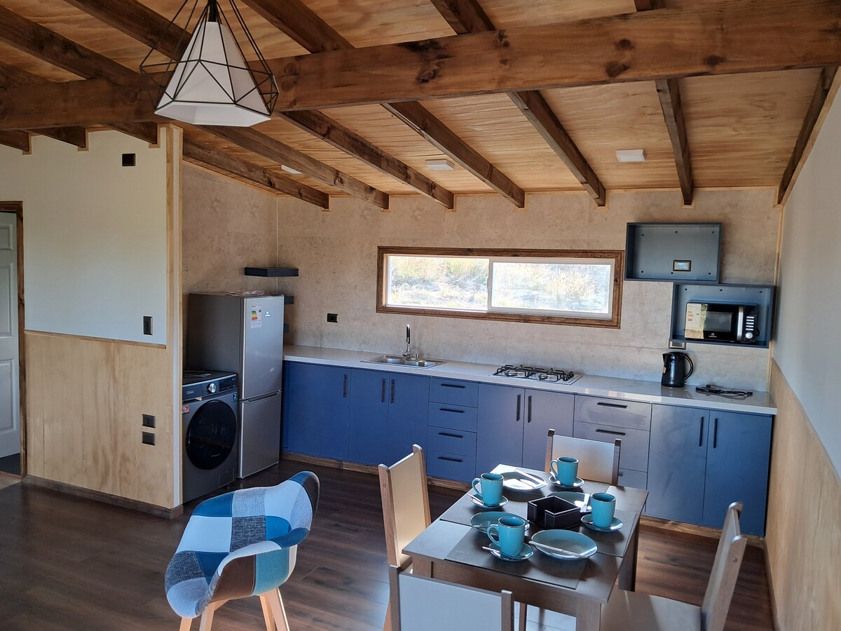 Pichi Cucao is a 13 m² cabin, ideal for couples or solo travelers exploring Chiloé. Its minimalist design invites you to enjoy the silence of the forest. Functional and bright, with a large terrace. It has a double bed next to a large window, a fully equipped kitchen, a private bathroom with hot shower, and air-conditioning heating with remote control. Located next to the Café del Bosque café-restaurant and right in front of Lake Huillinco, with direct access to the lakeshore.