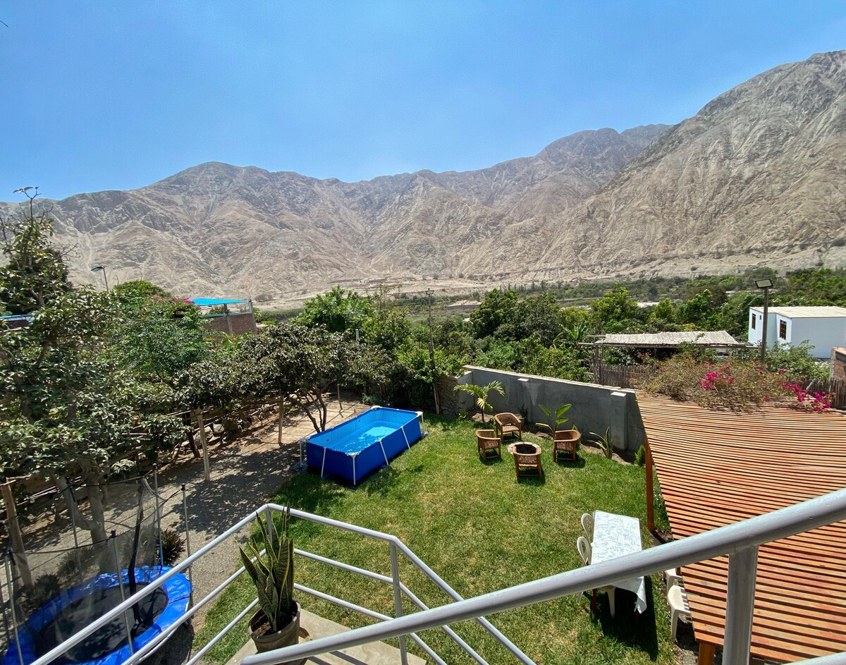 Nahaja se v prizidku San Jerónimo 7 minut vožnje z avtomobilom od trga Plaza de Lunahuaná in ima panoramski pogled na dolino, zelo blizu krajev za čolnarjenje, quatrimotos, nadstrešek. Kapaciteta hiše za največ 8 oseb. V tem mirnem prenočišču se lahko odklopite in sprostite z vso družino. Na voljo so elektrika, hladilnik, prostor za žar in zasebno parkirišče. Imamo TV, toplo vodo, Wi-Fi internet