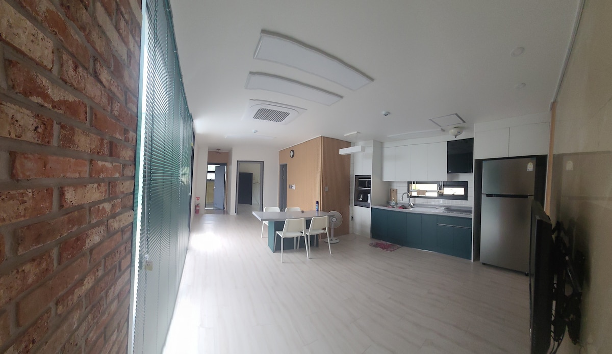 셀프체크인숙소입니다 -추가인원(1~2명가능) 1인당 2만원씩추가요금있음 숙소내에 식사를 만들어드실만큼주방에 가스렌즈' 전자렌즈모든시설이 갖추어져있습니다 다만 삽겹살 등 고기굽는 식사는 안됩니다. 다음 손님분들에게 불쾌감을줍니다 * 숙소는매우청결한숙소입니다 *엘리베이터는없습니다 계단은. 오르내리기 편한 계단입니다 48평이 (33평)복층(15평) 취침시 세대간,예민하신분들 따로공간이라 좋으실겁니다~ - 침구류. 특히 베게. 청결하게 관리합니다 -배겟니는.매번다리미질합니다 -샴푸린스바디워시(일회용)타월 치약 비누 넉넉한수건준비됨 -단독 게스트하우스입니다 -온가족 친구분들 함께 숙소이용하기 좁지않습니다 (화장실3개) 넓고 깨끗한숙소에서 머물기를. 원하는.게스트분들 예약!! -주변에 빽다방 매가커피, 각종체인치킨집,식당들,중형마트.편의점등 바로코앞에있음 -복층은 침실과 간이화장실이있어 예민한분들은좋습니다 -게스트 전용 주차2대 ,