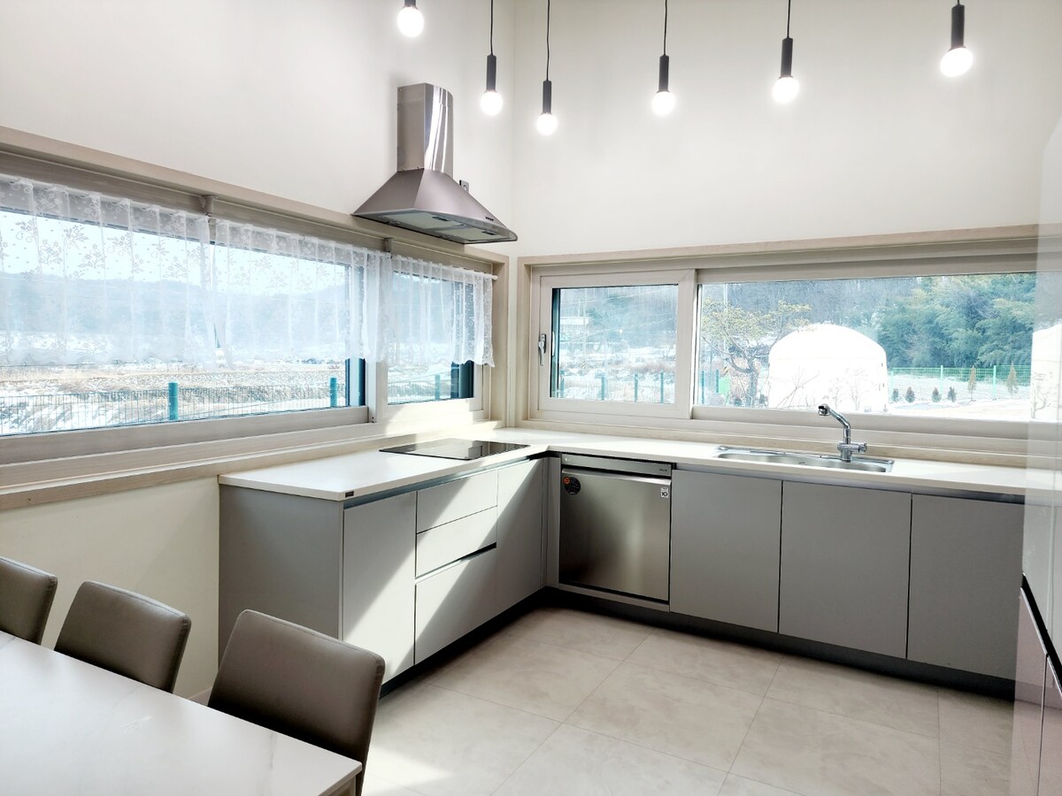 [눈꽃]이번에 새롭게 증축한 신축건물로 아늑하고 화사한 스타일 넘치는 공간이 어우러져 친구들/가족들과 함께 즐거운 시간을 보내기에 좋은 55평형 집입니다. 리조트 느낌을 주는 거실에서 주방까지 넓은 공간으로 여러 명이 함께 머물기에 적합하며,부드러운 베이지컬러와 엔틱한 소품들이 조화롭게 어우러져 따뜻하고 깔끔한 숙소입니다. 한 집을 통째로 사용할 수 있으며 가까이 주인이 상주하여 매우 관리가 잘 되어있습니다. 숙소 내에는 커다란 빔프로젝터가 준비되어 있습니다. 커다란 테이블이 주방과 루프탑에 준비되어있으며 세탁기와 건조기, 커피머신,정수기, 블루투스스피커까지 모두 구비되어 있습니다. 방은 총 3개이며, 고급 매트리스와 호텔식 베딩으로 셋팅하였습니다. 어메니티가 모두 구비되어 있는 욕실은 3개로 불편함 없이 사용이 가능합니다. 넓은 거실과 루프탑에 다 함께 모여 즐거운 추억을 남겨보세요:) *반려동물 입실 불가합니다. *이 외 궁금하신 점은 언제든지 문의주세요;)