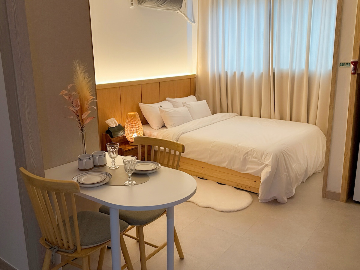 지브리 감성을 담은 아기자기한 감성숙소 입니다 북유럽풍과 일본 모던료칸의 인테리어를 믹스매치해 아늑한 침실을 자랑합니다 1층 공용카페는 무료 이용 가능하며 *무료 조식 서비스 (8가지반찬, 따뜻한 밥, 국) 월, 토 휴무 *OTT지원 (넷플릭스, 애플TV, 왓챠, 디즈니, 티빙 등) It's a cute and sentimental dorm with Ghibli's emotions Mix and match the interior of the Nordic style and the Japanese modern ryokan It boasts a cozy bedroom You can use the public cafe on the 1st floor for free Free breakfast service is available (toast, cereal, milk, ramen)