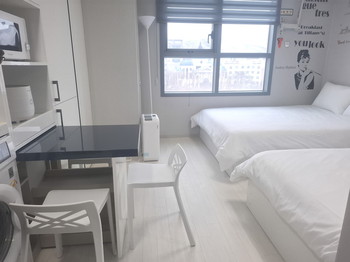Čista in polna čustev, vsaka soba je sestavljena iz studia in je 3 minute hoje čez prehod od izhoda 1 na postaji KTX Gangneung. Če vstopite v prenočišče v drugem nadstropju po sprehodu skozi urejeno zunanjost in preddverje, ki jasno izstopa v primerjavi z bližnjimi ustanovami, lahko udobno počivate v urejeni in urejeni notranjosti. Dostop do morja je enostaven za uporabo javnega prevoza, do ulice Wolhwa, priljubljene točke v Gangneungu, ki je priljubljena v kraju Gangneung, in 15 minut hoje do tržnice Jungang Market Food Village. Ustvarite še en spomin v posebni nastanitvi, ki je cenovno ugodna in urejena.