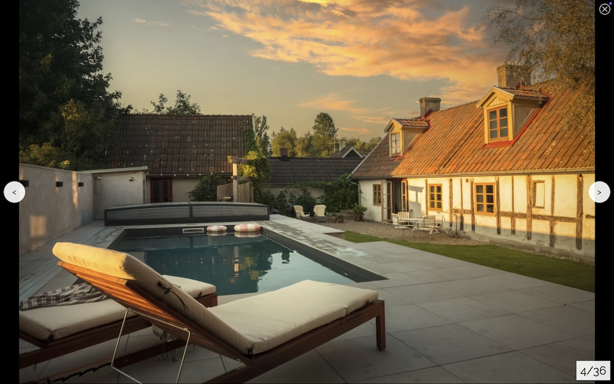 About this space Welcome to our charming 300 year old monk's cottage outside Kristianstad on a working horse farm. Entire house with separate courtyard garden, wood fired hot tub and a larger shared swimming pool. We are 10 minutes from Kristianstad, 20 minutes from Ahus and the same to beautiful beaches along the coast. Local amenities are (Supermarket, pharmacy, restaurant) within 3km of the cottage and the bus is 15 mins away.