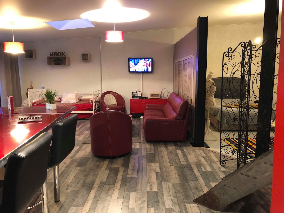 130 m2 stanovanje se nahaja v nekdanji tovarni v začetku 20. stoletja. Očala in kovinska struktura. 2min hoje od SNCF postaje in 5min od centra mesta. Tiho, zelo svetlo, veliko šarma, zaščitena terasa. 1 spalnica (s klimatsko napravo) + dodatno ležišče v dnevni sobi (kavč - 1 oseba). Zavarujte podzemno parkirišče. Kolesa na voljo. Možnost personaliziranega recepcije (dirke / šampanjec...) Opomba: Toplota možna poleti zaradi nadstreškov/oken brez zaklopa n.10387000273CE
