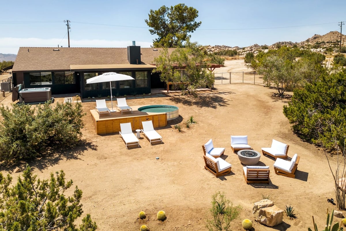THIS is why you come to the desert. Perched high above Yucca Valley you‘ll find The Edge, our modern & stylish 2 bed/2 bath desert getaway. It's quaintly secluded on a 2.5 acre lot, yet only minutes from town & Joshua Tree National Park. Explore the local attractions, hike from your own backyard or lounge the day away in our luxurious hot tub while marveling at THE BEST VIEW in the High Desert! ✔ 2 King Bedrooms ✔ Full Kitchen ✔Spa ✔Fire Pit ✔Hammocks ✔BBQ ✔ High-Speed Wi-Fi See More below!