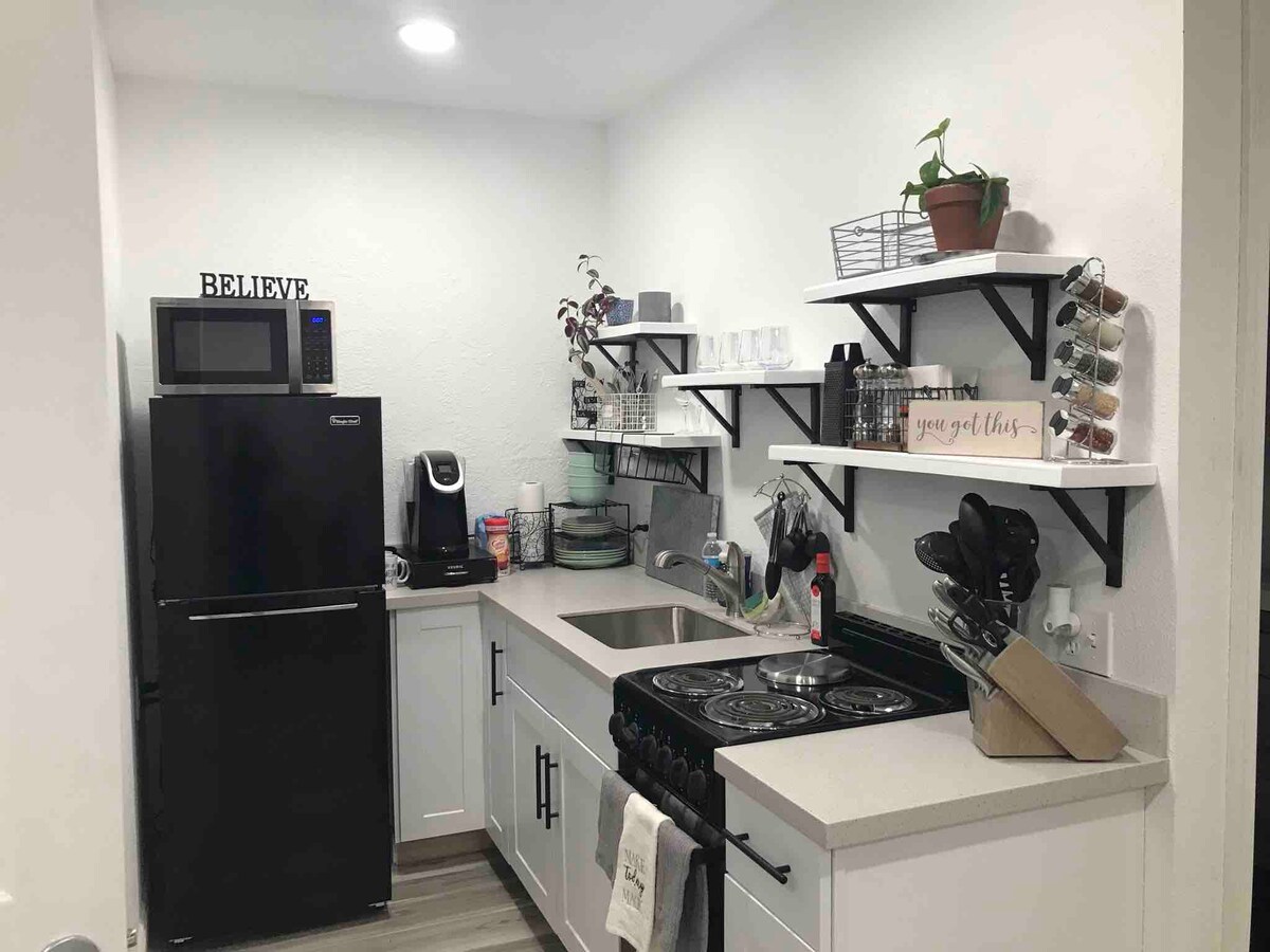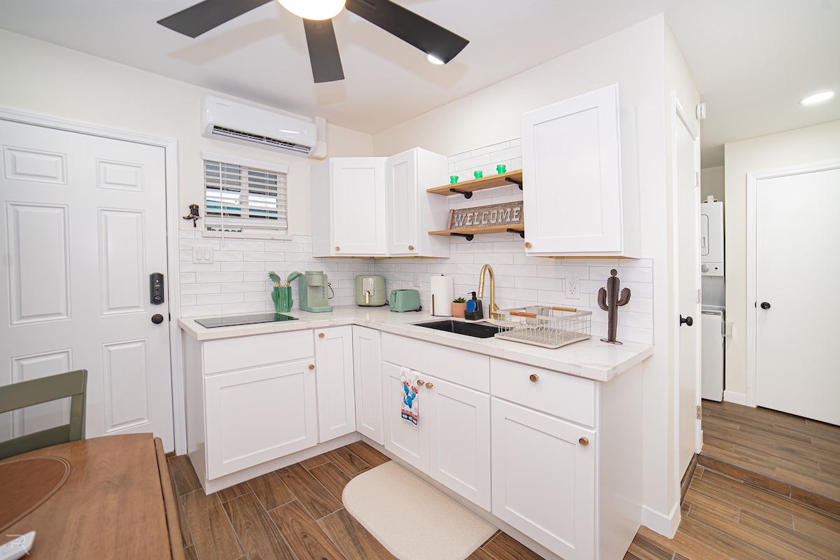 Bright, fully separate guesthouse in the back of a home with a separate entrance, ideal for two. Clean, modern, and thoughtfully equipped, this space offers privacy and comfort with in-unit washer and dryer, air conditioning, and a kitchenette. Easy access to local essentials—5 minutes to Onvida Hospital and Sprouts, and just minutes from coffee shops, restaurants, and neighborhood shops.