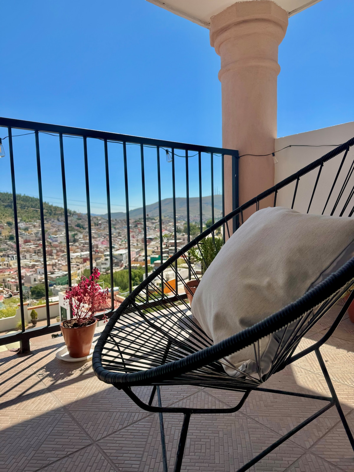 Penthouse v zgodovinskem središču Zacateas, 100 metrov od katedrale, s spektakularnim pogledom s terase. Ima 2 spalnici z zakonsko posteljo in omaro vsak, polno kopalnico, jedilnico, kuhinjo in teraso z žarom in servisno teraso s pralnim strojem. Brezplačna oprema. Hišni ljubljenčki niso dovoljeni. Kajenje je dovoljeno samo na terasi. Idealno za nekaj dni ogledov znamenitosti ali poslovanja. Nobenih STRANK ali SESTANKOV NI DOVOLJENO