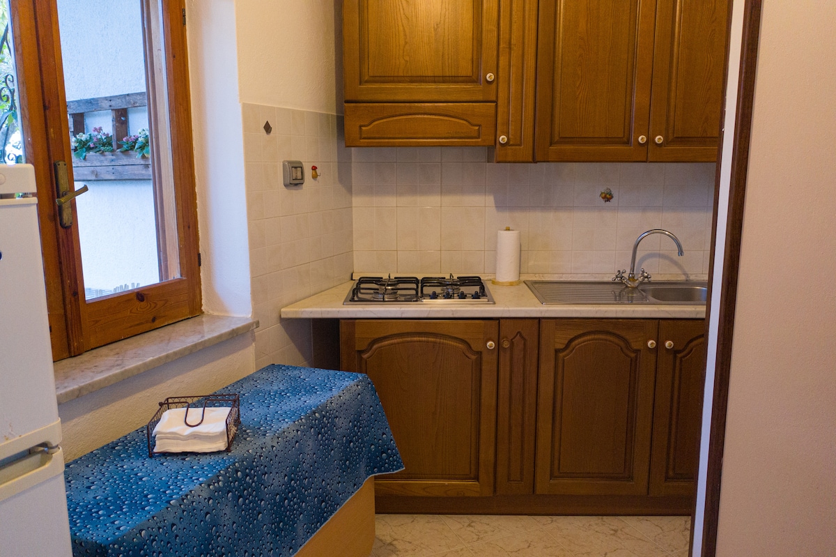 Garsonjera se nahaja v pritličju stare prenovljene kmečke hiše. Opremljen je z zunanjo verando s senčnikom, mizo, stoli in ležalniki, pred nastanitvijo pa je skupni prostor urejenega vrta z bralnim kotičkom in ležalniki ter kotičkom za žar, znotraj namestitve pa je tudi parkirno mesto. Stanovanje s površino 20 m2 je sestavljeno iz dvoposteljne spalnice in edinstvene kuhinjske sobe ter samostojne kopalnice s tuš kabino.