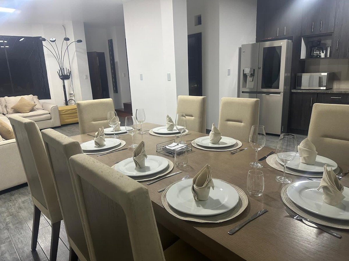 Nuestra Casa está compuesta de: gran cocina - comedor, un dormitorio doble y un dormitorio grande con baño y ducha , un cuarto de estudio , 1 baño y ducha en el corredor de la casa para demás huéspedes, sala de estar , A/C, equipo de sonido , turco y ducha , en la lavandería dispondrá de lavadora , en la parte trasera de la casa tendrá un espacio para hacer parrillada, cuenta también con garaje automático privado , servicio de agua caliente , refrigerador, cocina , vajilla y demás utensilios