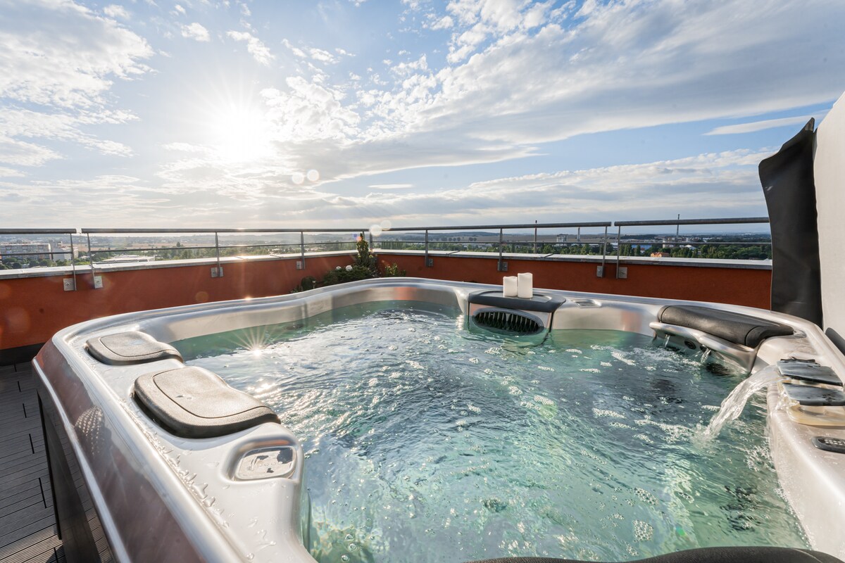 Sodobna nova nastanitev v mirnem predelu z zanimivim razgledom na gore Říp, Ještěd, Bezděz in mesto Mělník. Velika terasa v velikosti 80 m2 z zasebno celoletno masažno kadjo Villeroy&Boch in savno z udobnim prostorom za sedenje ali sprostitev v popolni zasebnosti. Penthouse se nahaja v zadnjem 13. nadstropju in ima notranjo bivalno površino 120 m2.