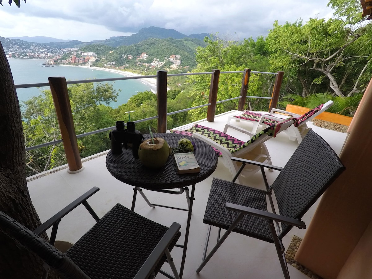 "El Mango" is a stunning casita with total privacy and spectacular views of the Bay of Zihuatanejo & the Pacific. Perched high above Playa La Ropa and Las Gatas, it's just a short walk to either. Nestled in this idyllic setting, "El Mango" is surrounded by lush gardens and tropical fruit trees. Yes, that's a mango tree draped over the balcony. It is a two story walkup. Sit out on the balcony at sunset sipping your favorite cocktail or soak in the splash pool and take in the panoramic view.