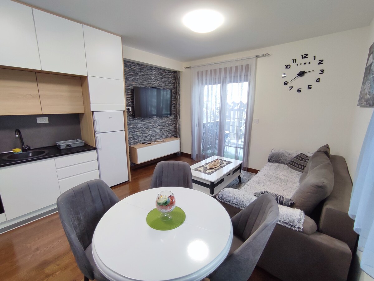 Apartma se nahaja v 2. nadstropju stavbe z dvigalom, kapaciteta za 4 osebe v mirnem delu Zlatibora, le 5 minut hoje od jezera in centra. Ima 2 ločeni sobi, dnevno sobo in spalnico (dve postelji 160x200) + pomožno posteljico s kompletom posteljnine za dojenčke. Brisače in posteljnina za vsakega gosta posebej. Terasa s pogledom na gorsko kočo in naravo. Hiter internet in kabelska televizija z več kot 100 kanali, na 2 televizorjih. Popolnoma opremljena kuhinja. Parkirišče z video nadzorom.