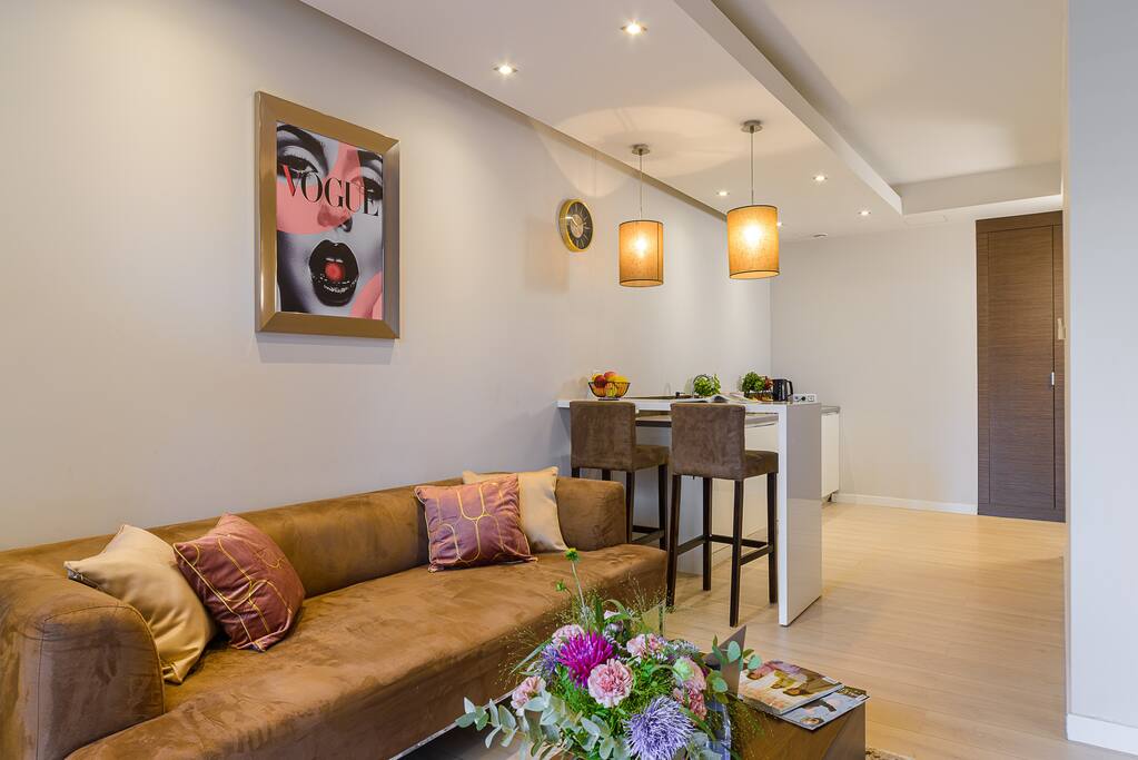Przestronne klimatyzowane mieszkanie na 12 piętrze może pomieścić do 6 osób. Składa się z dwóch sypialni, salonu z rozkładaną sofą, aneksu kuchennego i łazienki z prysznicem. Mieszkanie oferuje przestronny salon z stylową sofą, telewizorem i balkonem. Wyposażone jest w niezbędne sprzęty kuchenne i łazienkowe, a także posiada bezpłatne Wifi i telewizor z płaskim ekranem. Kunsztowna kolorystyka w odcieniach szarości i żółtego podkreśla nowoczesny i przytulny charakter mieszkania.