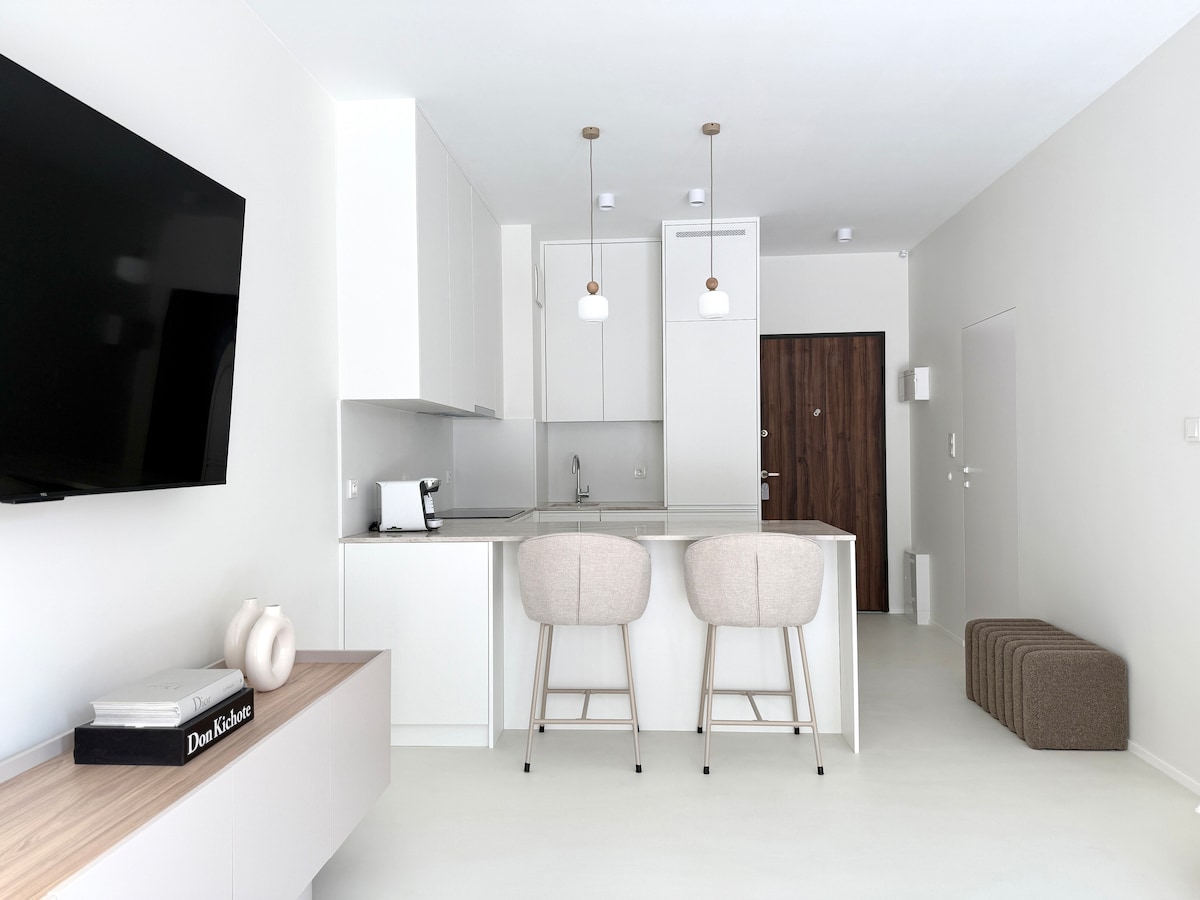 Apartament bardzo dobrze nasłoneczniony, zaprojektowany z dbałością o każdy detal. Oryginalne połączenie mikrocementu, kwarcytu i naturalnego światła sprawia, że przebywając w tym miejscu czujemy się wyjątkowo każdego dnia. . Apartament został wyposażony w okazały telewizor o wielkości 65 cali. W przestronnej kuchni z praktyczną i pojemną zabudową meblową największe wrażenie robi blat kuchenny pełniący jednocześnie funkcję stołu wykonany z naturalnego kamienia - kwarcytu Taj Mahal.