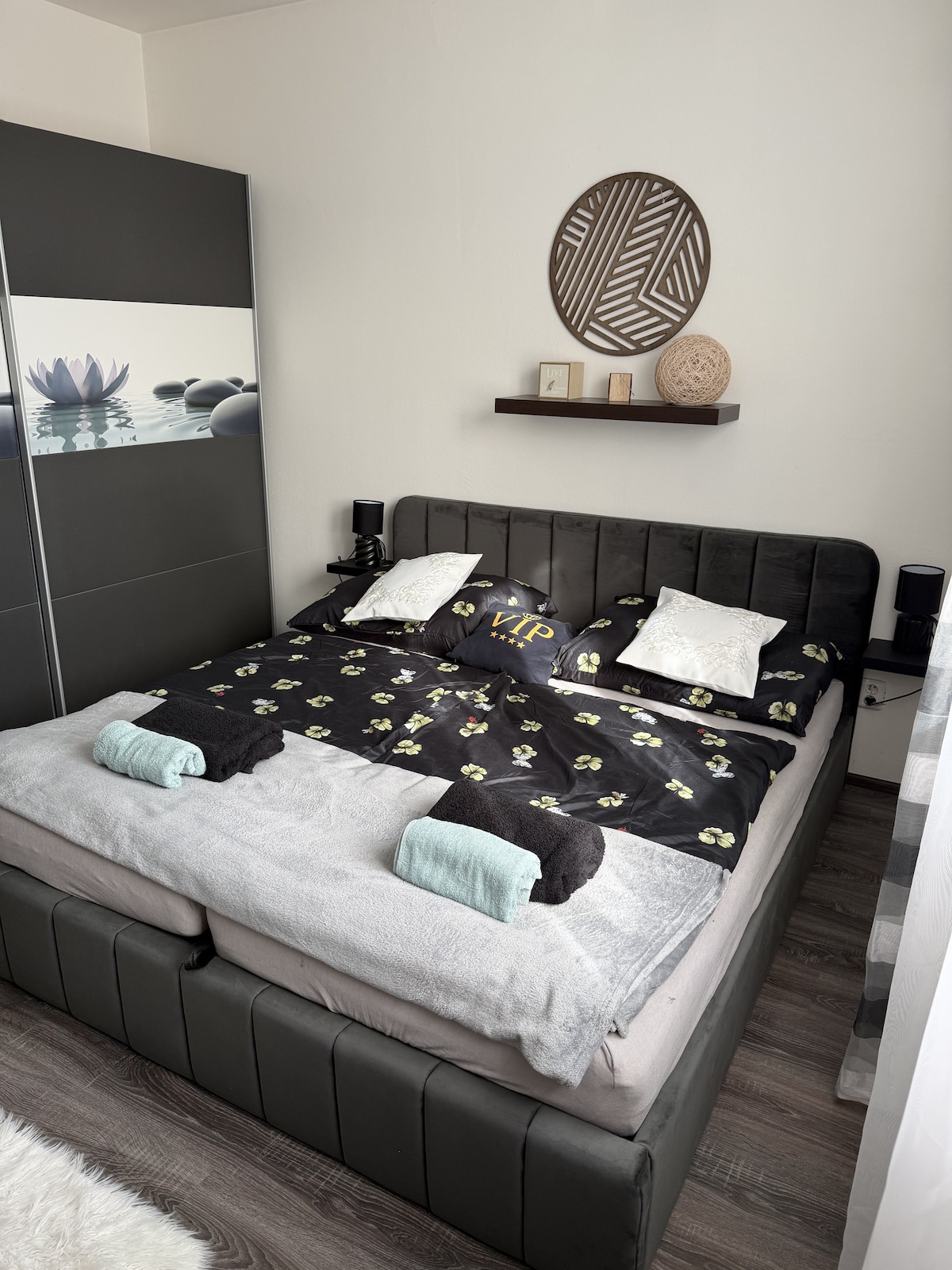 Dobrodošli v našem sodobnem stanovanju v Znojmu. Iz 6. nadstropja boste uživali v čudovitem razgledu na mesto. 52m² stanovanje ima dve sobi: dnevno sobo s televizijo, pisalno mizo in raztegljivim kavčem (190x120) ter ločeno spalnico s posteljo (200x180). Kuhinja je opremljena z vgrajenimi napravami, kuhinjsko posodo, barom in aparatom za kavo. Na voljo je kopalnica s prho in ločenim straniščem. Spalnica je klimatizirana, dnevna soba pa ima prezračevanje. Nasveti za potovanje: zgodovinsko središče Znojma, Vranov nad Dyjí, NP Thaya.