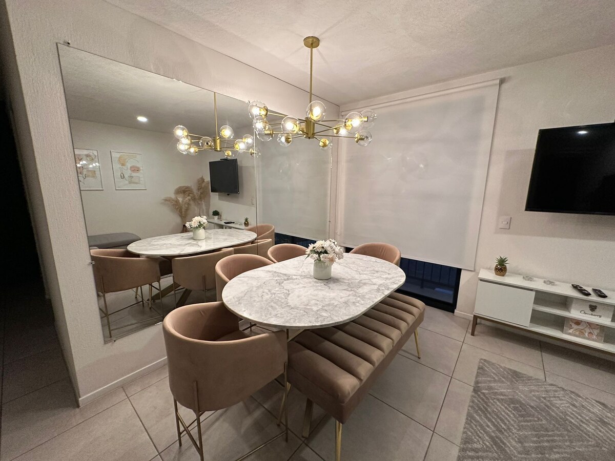 Uživajte v udobnem bivanju v našem dvosobnem apartmaju in na raztegljivem kavču med obiskom mesta. To prenočišče ponuja sproščeno vzdušje, ima kopalnico, kuhinjo, teraso in parkirišče. 5 minut od peska Guadalajara, živalskega vrta, čarobne džungle, kanjona huentitan, oblatov, trga neodvisnosti. ograj stadiona Jalisco, Akron, središče Guadalajare, 30 minut od letališča. Najdete lahko tudi bližnje trgovine, trgovine in lekarne.
