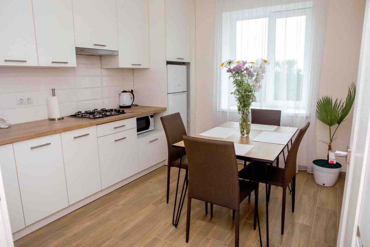 Udobno stanovanje z 1 spalnico v novem okrožju Uman, 10 min hoje od avtobusne postaje in osrednjega vhoda v Sofijevski park. Na voljo je centralno ogrevanje, brezplačen Wi-Fi, TV z ravnim zaslonom in popolnoma opremljena družinska kuhinja. + popolnoma opremljena kuhinja + Velika zakonska postelja+ raztegljiv kavč + non stop topla in hladna voda + čista posteljnina